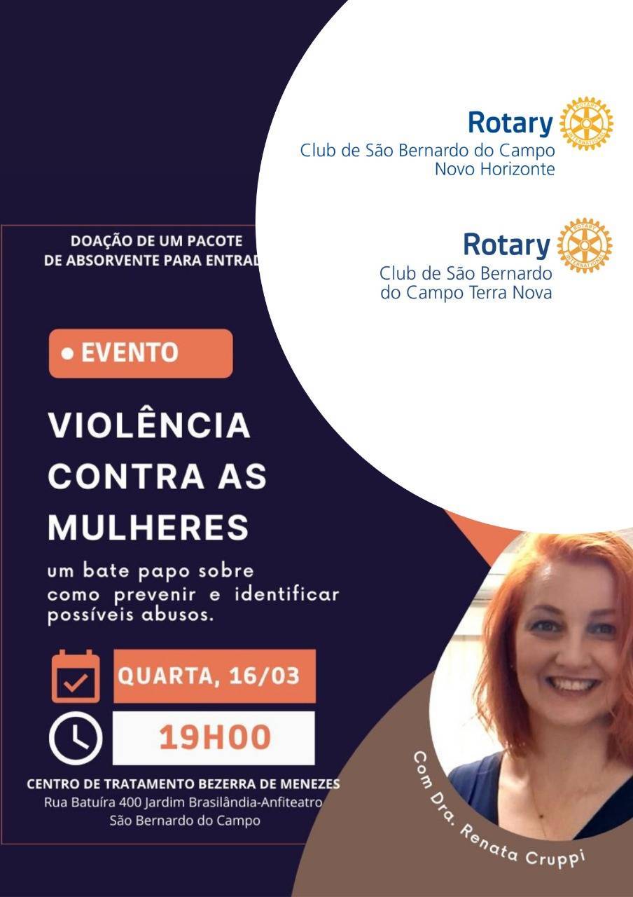No dia 16 de março o Rotary Club de São Bernardo do Campo “Terra Nova” “Novo Horizonte” irão promover uma palestra sobre formas de violência contra a mulher. Um bate papo sobre como prevenir e Identificar possíveis abusos. Aproveitando o tema e o mês da mulher, homenagearemos algumas mulheres de grande representatividade da região