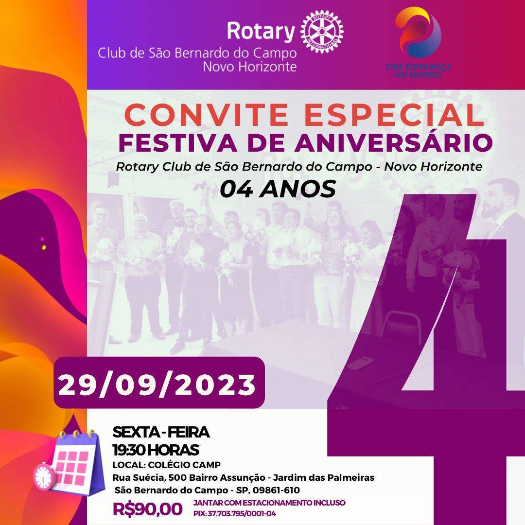 São Bernardo do Campo, 6 de setembro de 2023 - O Rotary Club de São Bernardo do Campo Novo Horizonte está prestes a comemorar um marco significativo em sua jornada. No dia 9 de setembro de 2023, o clube celebra seu quarto aniversário desde sua fundação. Há quatro anos, em 5 de setembro de 2019, o Rotary Club de São Bernardo do Campo Novo Horizonte foi oficialmente registrado.